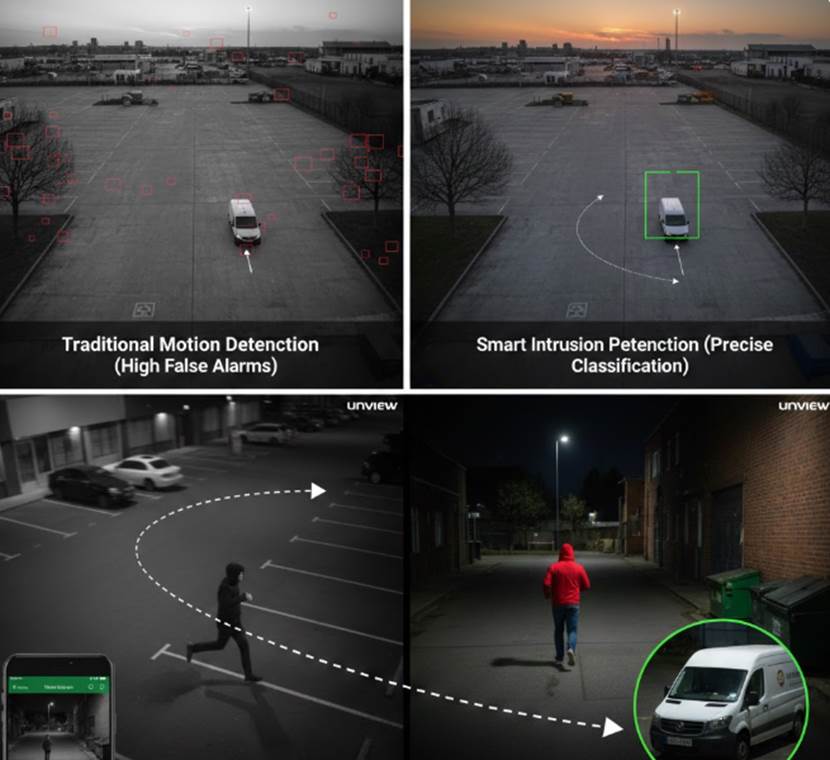 A: Old systems send an alarm whenever anything moves, like a leaf or a shadow. SIP uses smart logic to look at the actual shape and way things move. It specifically looks for people and cars. You can set the system to ignore everything else, which means you only get a buzz when a real target walks into a blocked zone or steps over a line you drew on the screen.