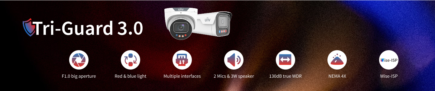 UNV Tri-Guard technology combines Smart Intrusion Prevention (SIP), ColorHunter, and Active Deterrence to prevent crimes at night. It not only alerts during events but also captures color details in low-light environments.